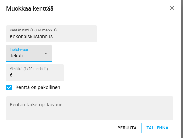 - Voit määritellä kentälle halutessasi yksikön (esim. numerotyyppiseen €/h, €, €/km jne)