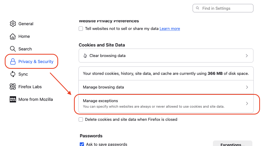- Privacy settings ja etsi kohta Manage exceptions ja klikkaa se auki