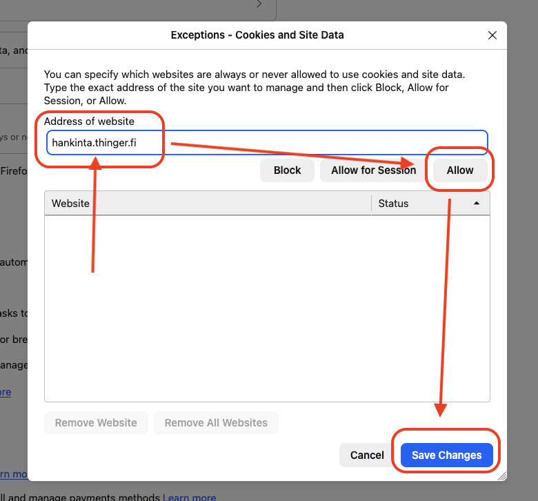 - syötä kenttään hankinta.thinger.fi,paina Allow ja sitten Save Changes