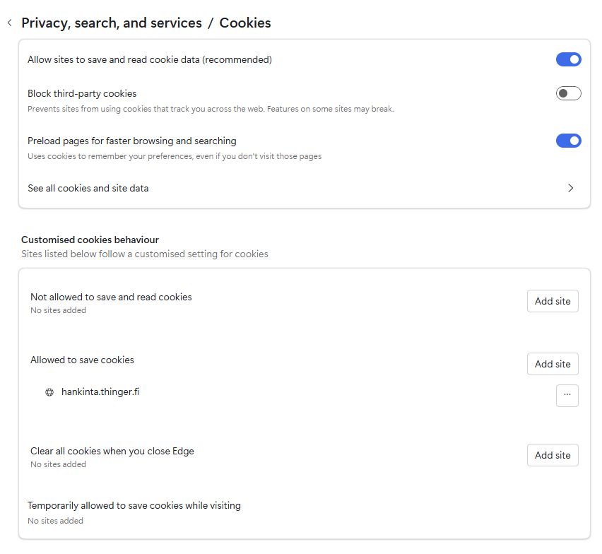 - Lisää/Add site, jos haluat sallia evästeet sivustokohtaisesti kirjoittamalla sivuston URL-osoitteen.