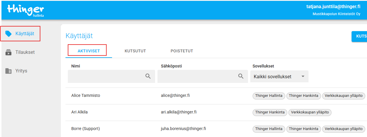 Näkymä Käyttäjät - Aktiiviset. Valitse oikea käyttäjä.