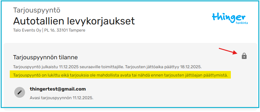 Kun tarjouspyyntö on lukittu ja kilpailutuksen tilanne jaetaan sidosryhmälle, tieto lukituksesta näkyy seuraavalla tavalla: