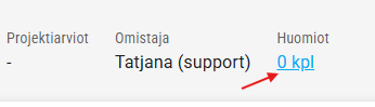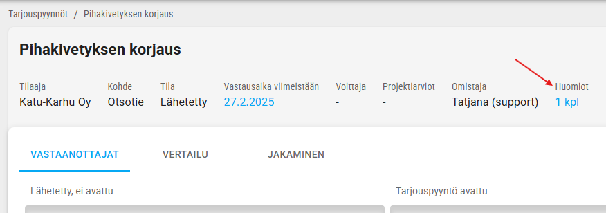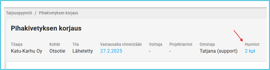 Voit tarvittaessa lisätä tarjouspyynnölle huomioita ts.muistiinpanoja. HUOMIOT- osio löytyy työpöydän yläosasta, ks.kuva