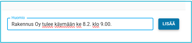 Uuden huomion voi lisätä alkamalla kirjoittaa Huomio- kenttään, LISÄÄ- painike aktivoituu.